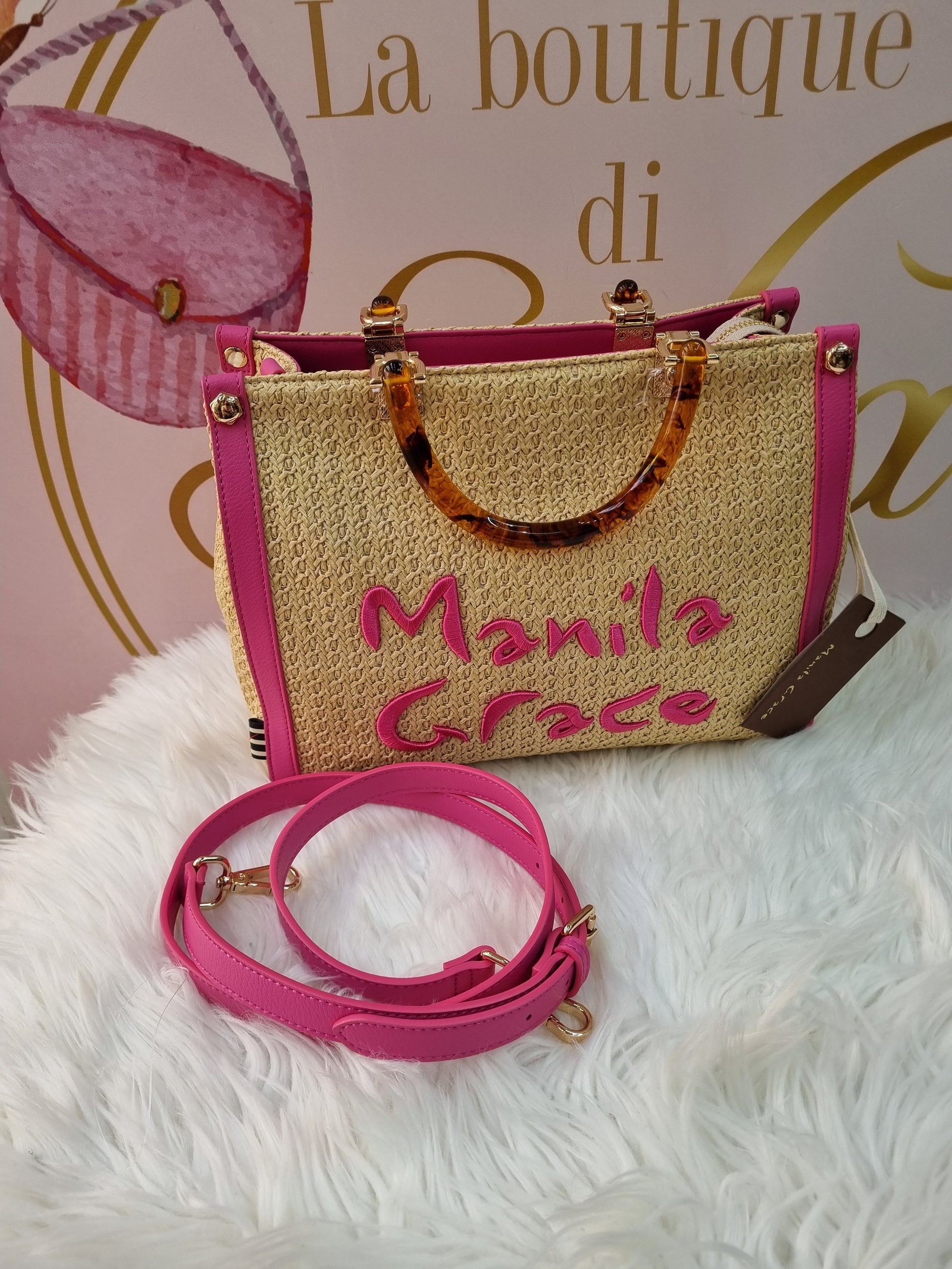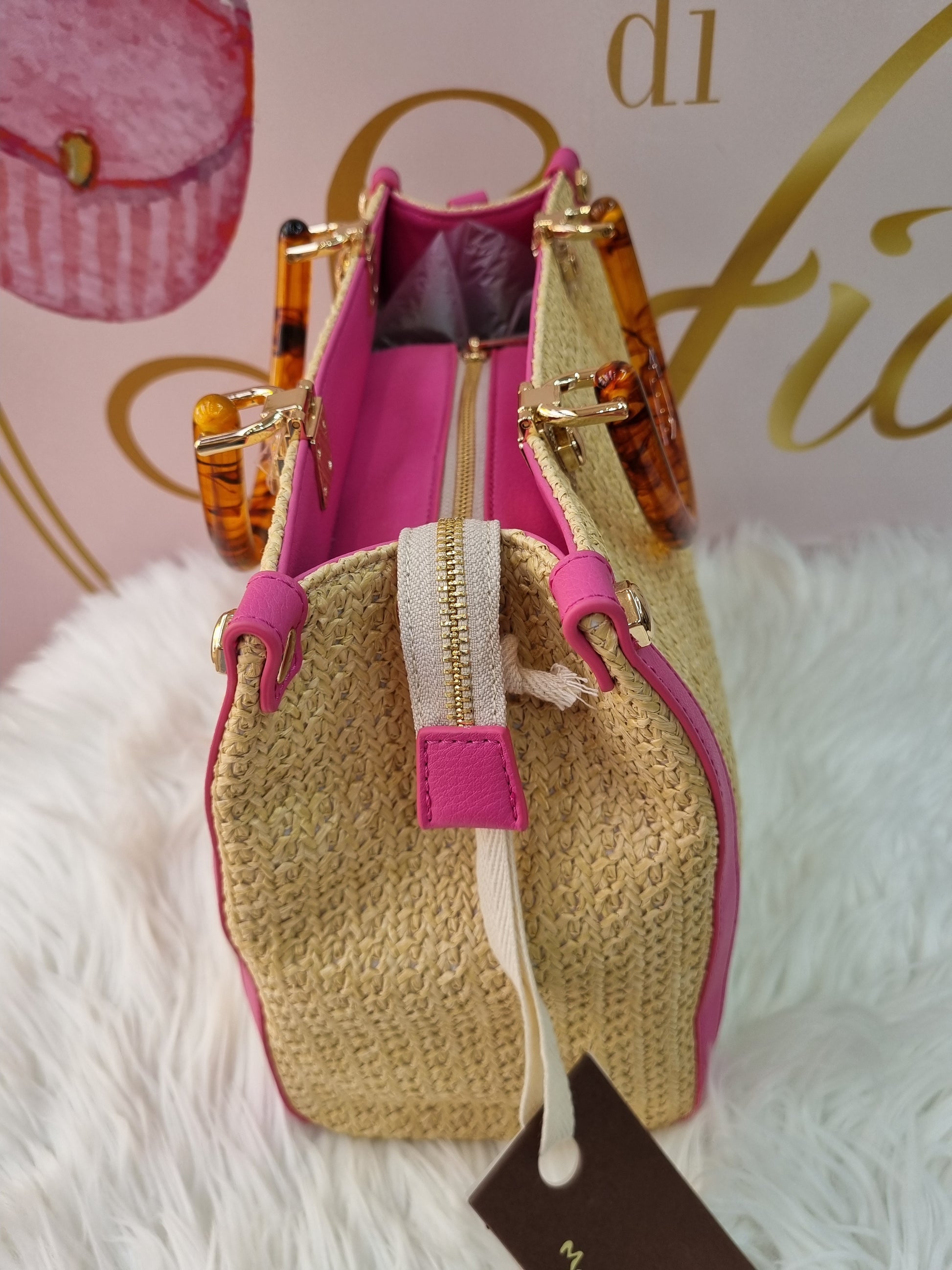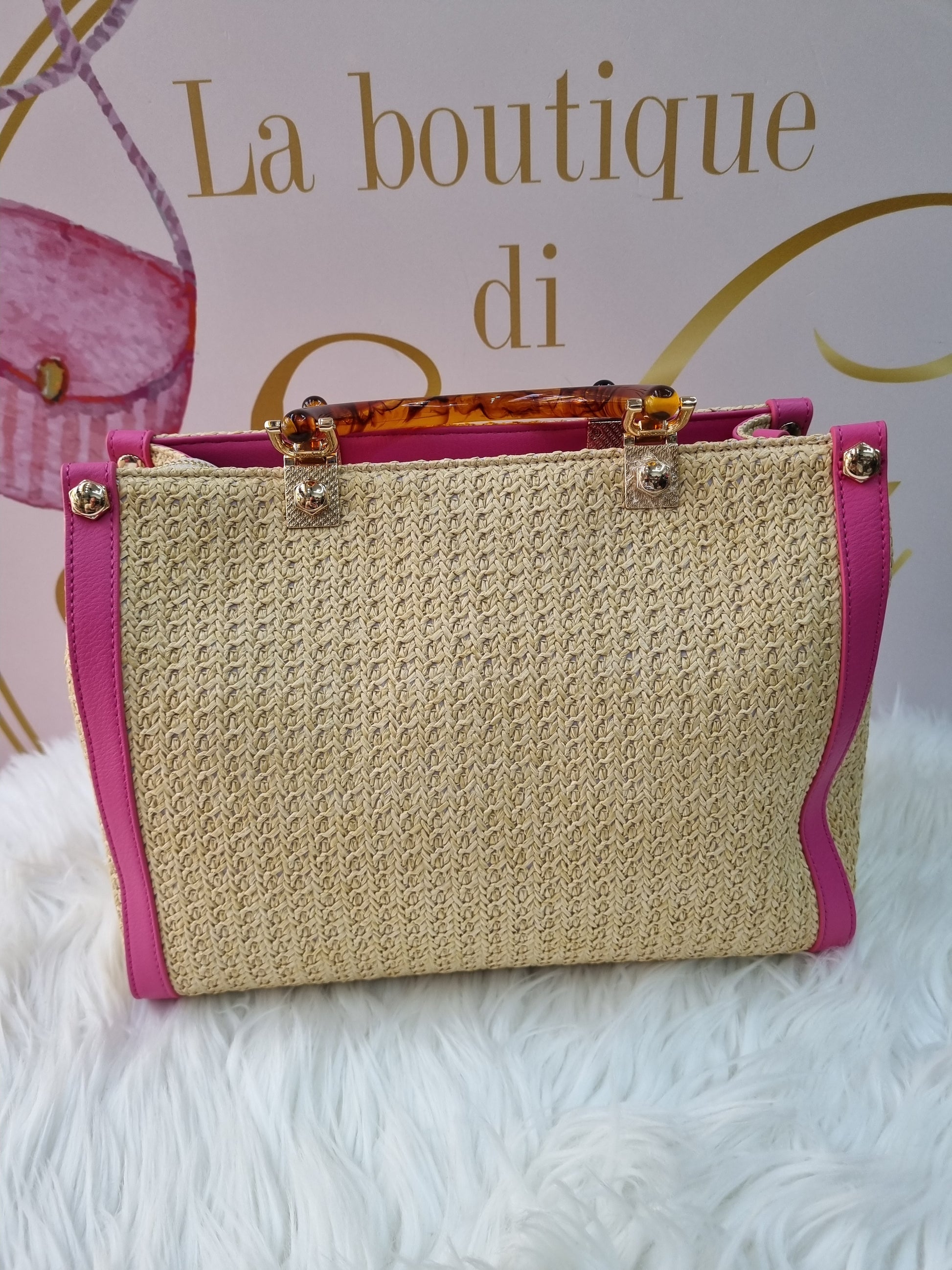 in rafia con manici effetto legno e tracolla regolabile